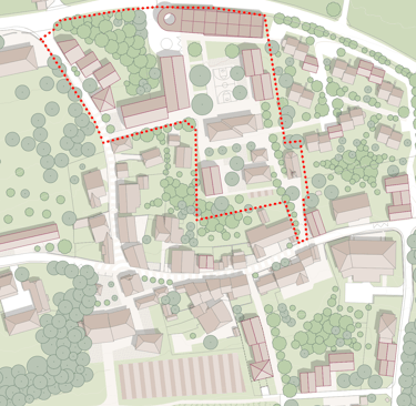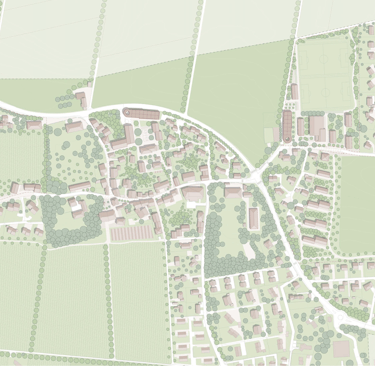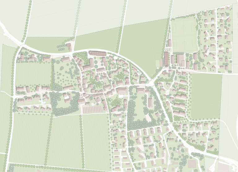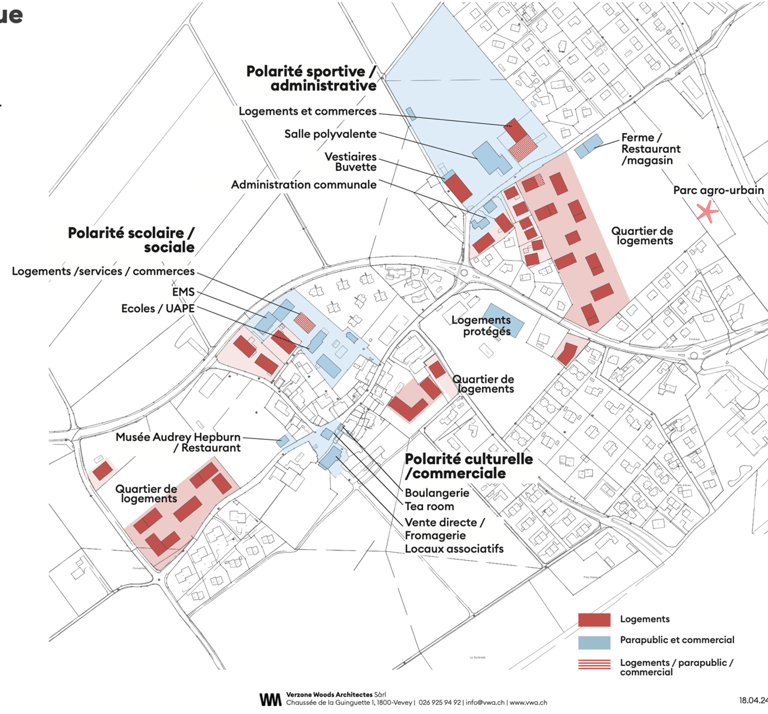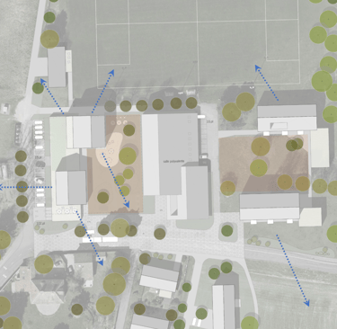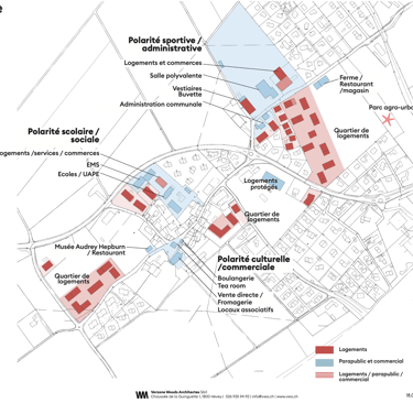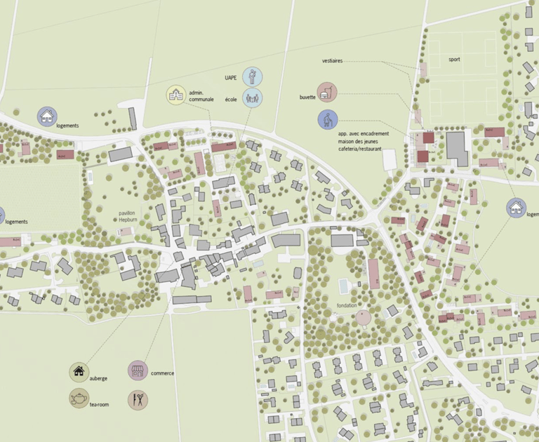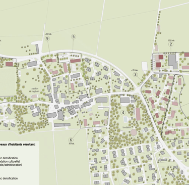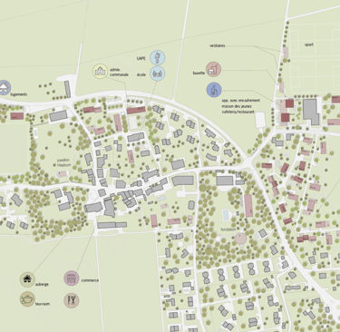 Ce cabinet a retenu trois polarités dans le village, une polarité administrative au centre, une scolaire autour de l'école et une sportive autour des terrains de foot et de la salle polyvalente.