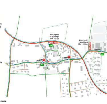 Circulation, pour réduire les vitesses de circulation (rue du centre et chemin des Plantées) et ajouter des liens de mobilité douce.